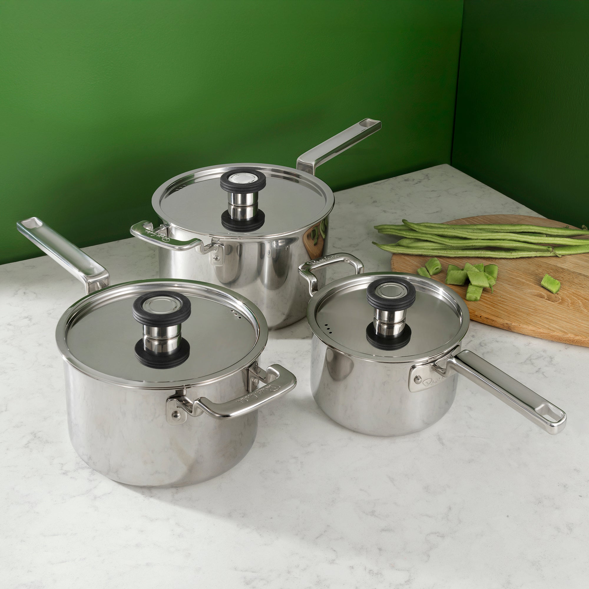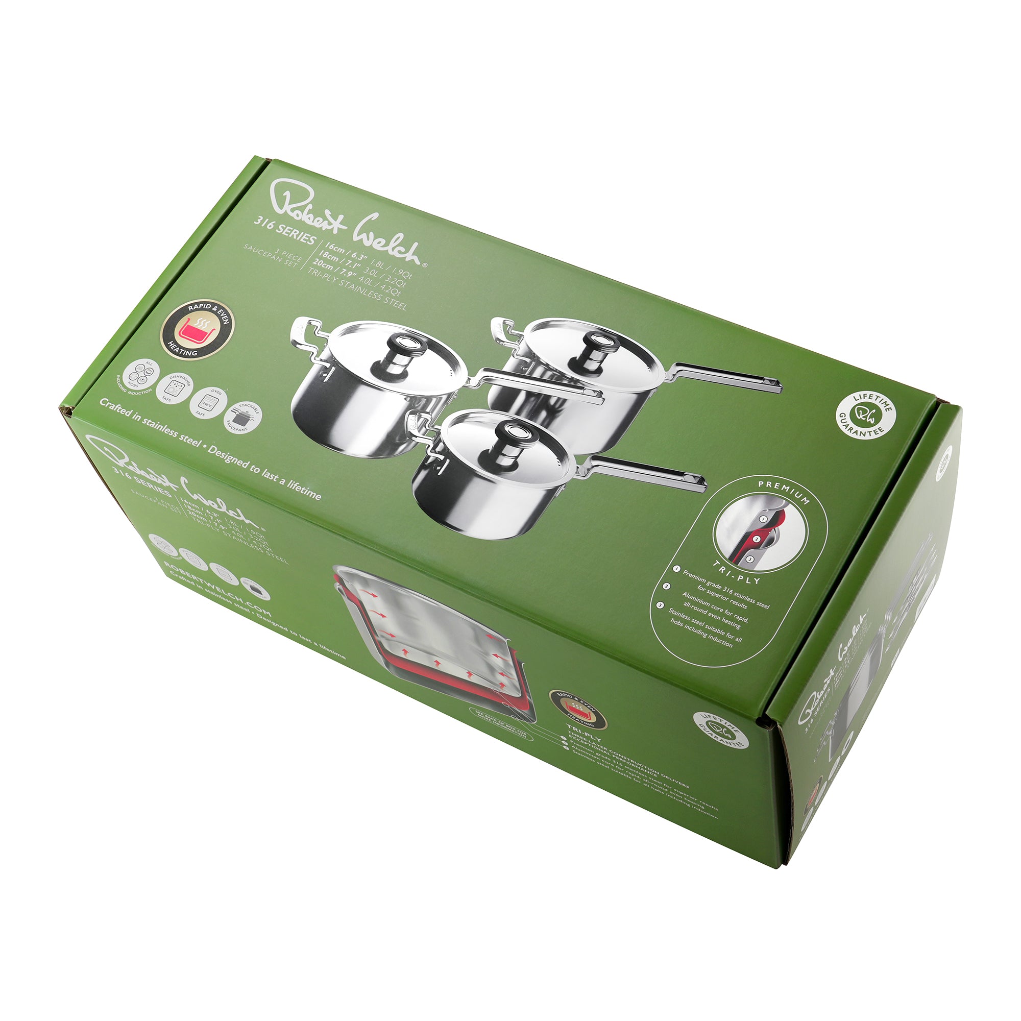 The 3-piece set comprises of a 16cm, 18cm and 20cm saucepan with tri-ply construction: Two layers of high-grade stainless steel fully encapsulate a responsive aluminium core that extends throughout the pan from base to rim, ensuring rapid, even heat distribution.